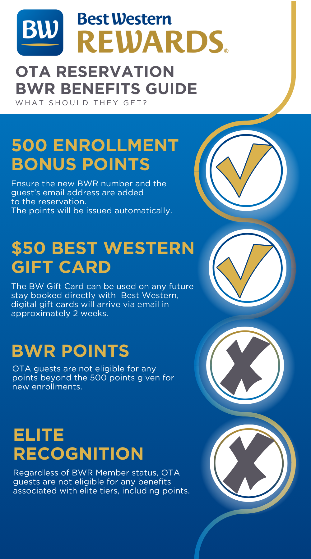 - Depending on the current promotion, OTA guests may not qualify. If that is the case, let your guest know that they will receive 500 points for enrolling. Also, inform them that booking direct is a cheaper alternative to the OTAs and they will receive BWR points and promotional offers.