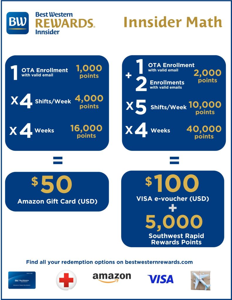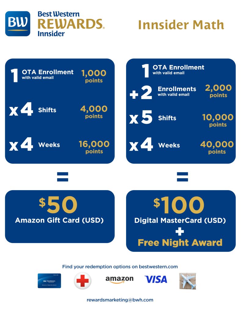 The Innsider Program is a great program that offers you the opportunity to earn BWR Points when you enroll new members into our Best Western Rewards loyalty program. The program is free to join and points can be used for gifts cards, free night stays, and more!